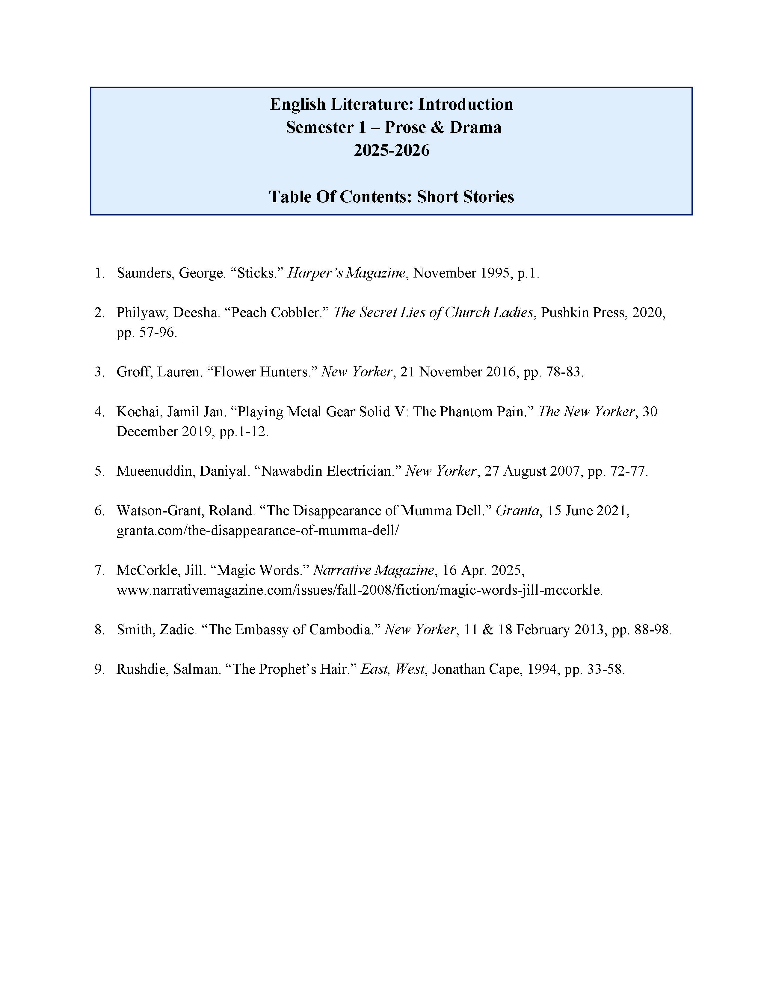 English Literature Introduction: Short Story Reader